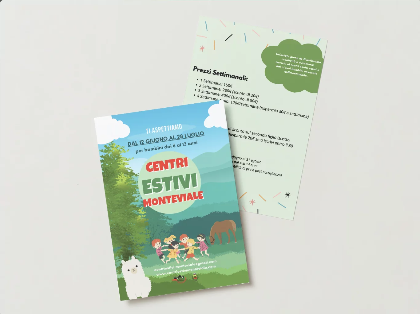 Questo coloratissimo volantino è pensato per attirare genitori e bambini ai centri estivi, con una grafica allegra e dinamica. Le attività proposte spaziano da sport, laboratori creativi, giochi all’aperto e gite, e ho inserito un calendario con le date, gli orari e le informazioni per le iscrizioni. Il design riflette il divertimento e l’energia dei centri estivi, ideale per famiglie in cerca di attività coinvolgenti.